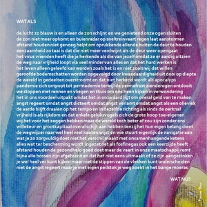 2021Gedicht dat bijna explodeert van de vragen die deze tijd tekenen op een achtergrond van aquarel met vragende beweging. Het werk is vierkant en verkrijgbaar als afdruk in een maatvoering en op materiaal naar keuze. Oplage 5 stuks.